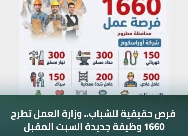 كتب أ.محسن البتانونى أعلنت وزارة العمل، بالتنسيق مع مديرية عمل مطروح، عن إتاحة 1660 فرصة عمل في عدد من التخصصات…